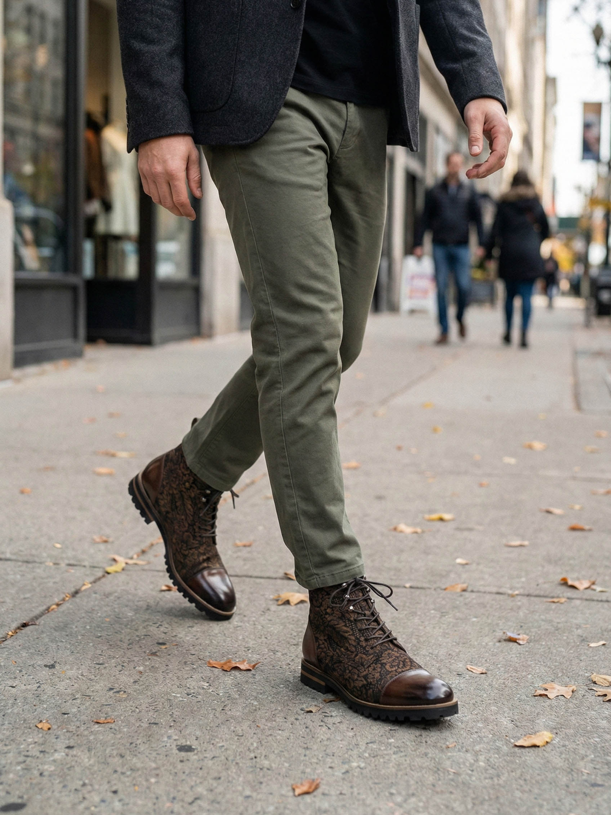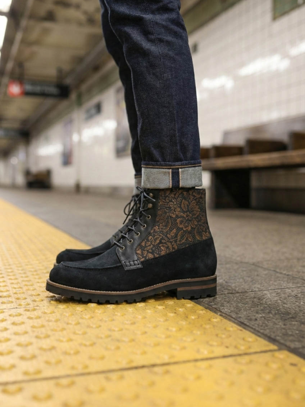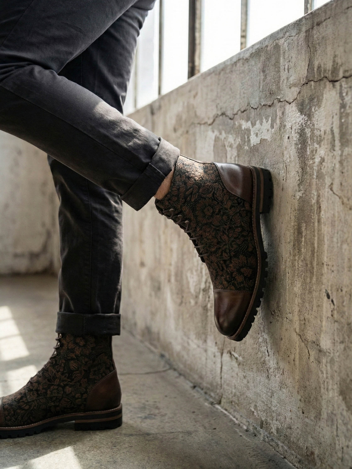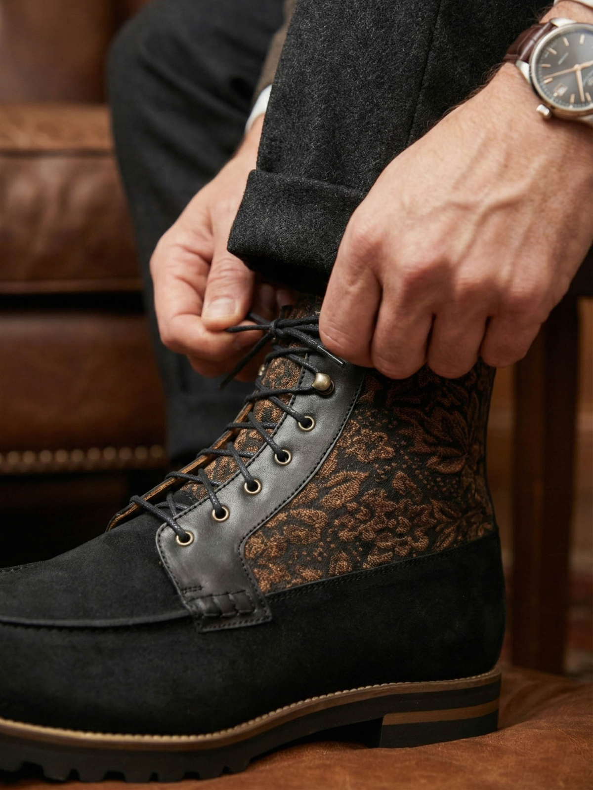 The texture of history. Our first designer footwear drop features the exclusive Bursa Brunello tapestry, sourced from Turkey's historic textile district. Inspired by the earth tones commissioned by Italian merchants centuries ago, this weave features matte tobacco-brown motifs on a black ground, offering a rugged, versatile alternative to suede that pairs with any color in your wardrobe.